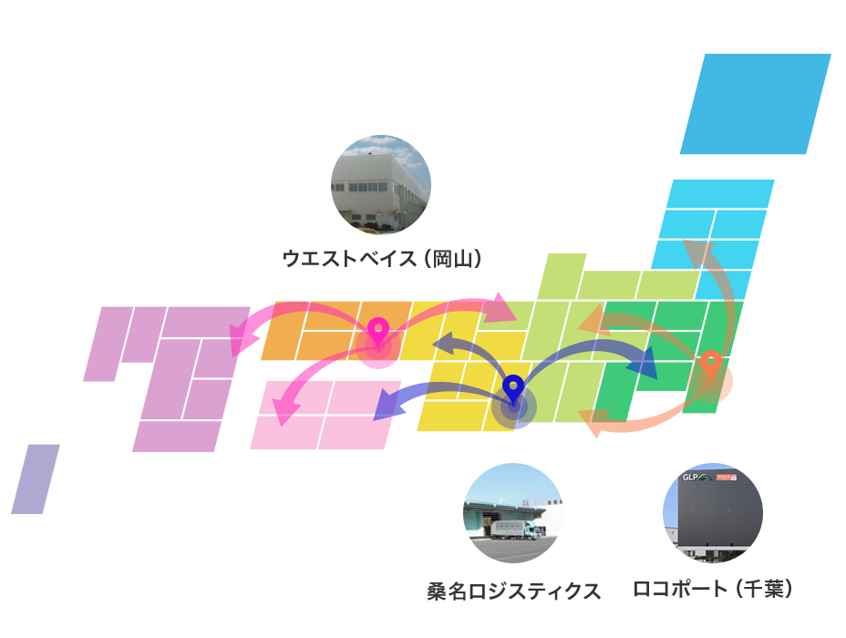 「千葉」「三重」「岡山」の三拠点にEC・BtoB物流センターを構え、全国へのデリバリーを最短で行うことが可能です。