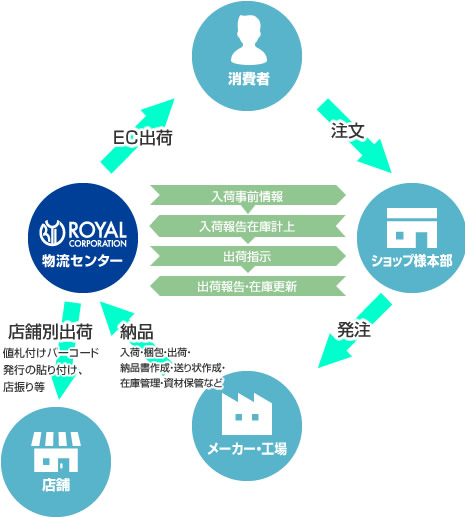 EC販売では、楽天市場、Yahoo!ショッピング、アマゾン(FBA対応含む)、auPAYマーケット、Qoo10等の大手主要ECモール、中国向け越境ECにも対応。